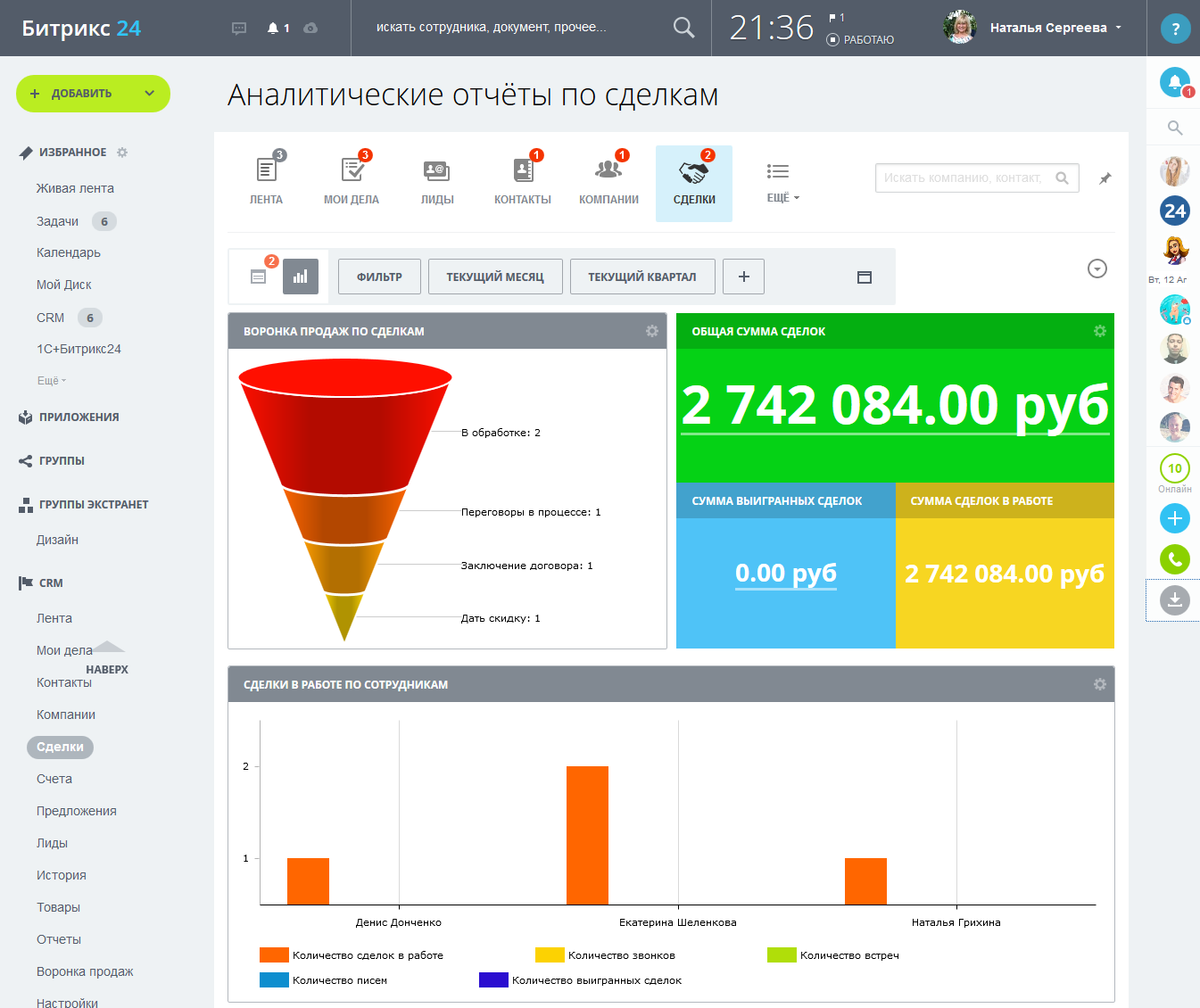 CRM-система (Customer Relationship Management) служит для учета потенциальных и текущих клиентов, журналистов, партнеров и других «лидов». Полученные разными способами «Лиды» загружаются в CRM-систему, после чего распределяются между сотрудниками, которые связываются с потенциальными клиентами и отмечают результат на портале. В отчете CRM-системы строится воронка продаж с настройкой неограниченного числа уровней. CRM-систему можно интегрировать с сайтом компании, чтобы сохранять полученные лиды (например, заполненные веб-формы) напрямую в CRM на корпоративном портале. Вы можете выставлять счета в CRM и следить за статусами их оплаты. Вы можете с любого мобильного устройства оперативно получать информацию из CRM - мобильно следить за содержимым CRM: за каталогом товаров, клиентской базой, своими делами и сделками.
