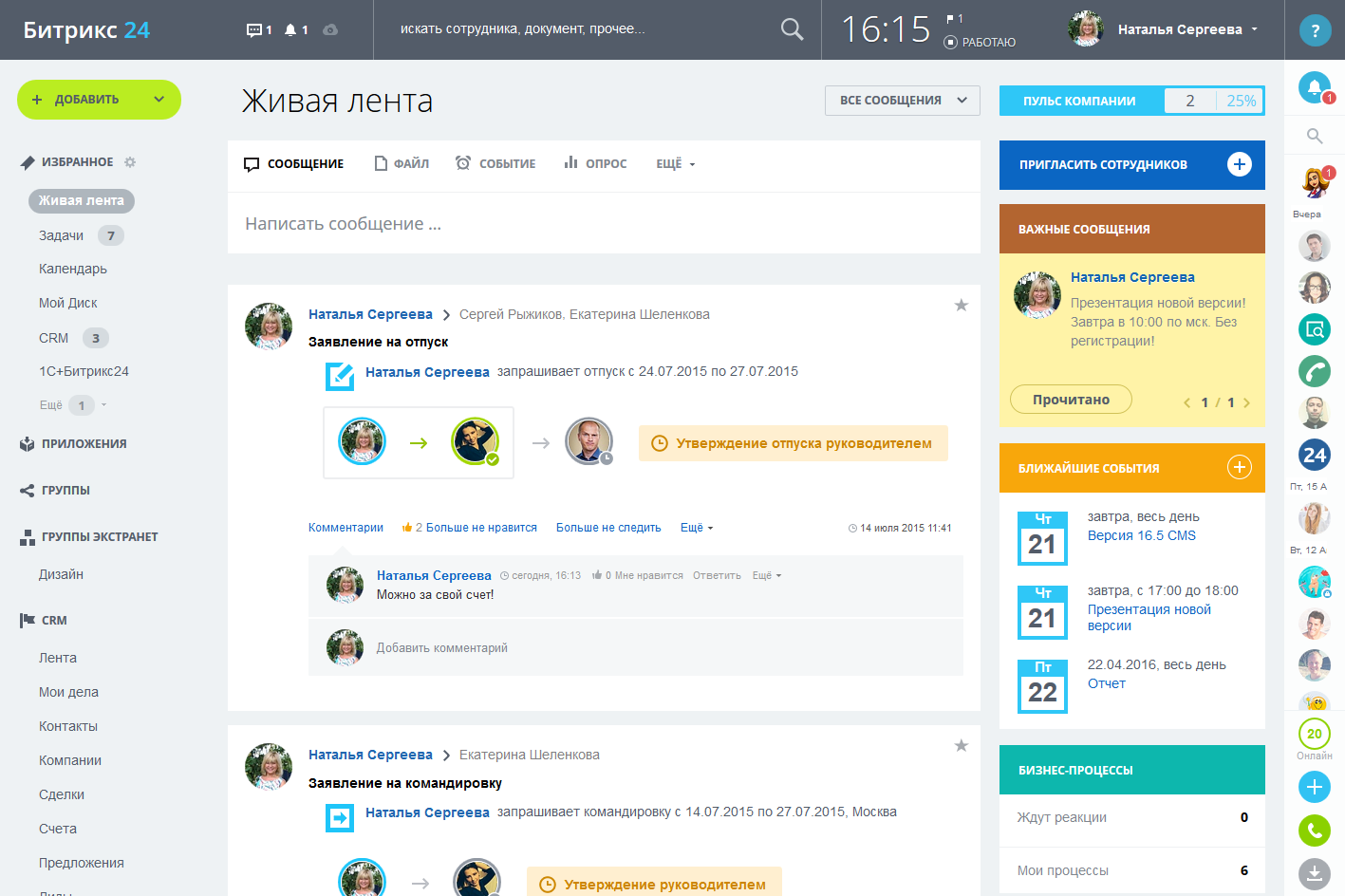 Установите мобильное приложение (iOS, Android), - и сможете работать с порталом со смартфона: читать «Живую ленту»; управлять документами, задачами и файлами; просматривать, отправлять, комментировать и «лайкать» сообщения. Push-уведомления позволяют быть в курсе событий в компании и всегда оставаться на связи с коллегами. Возможности