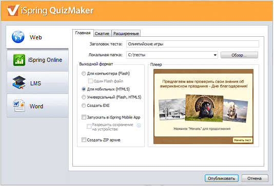 iSpring QuizMaker 8 позволяет сохранить тесты и опросы в формате Flash и HTML5, благодаря чему они доступны для прохождения на компьютерах и мобильных устройствах, в том числе iPad и iPhone.