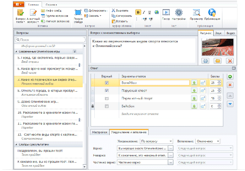 - Построение сценариев ветвления в зависимости от правильности ответа на вопрос