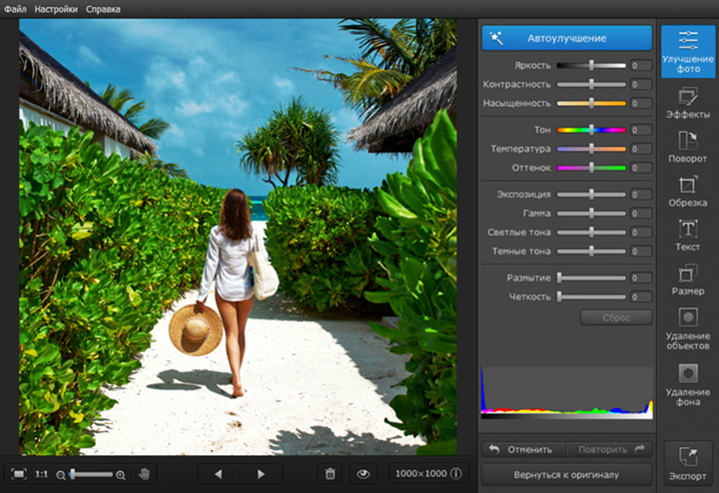 Фотография вышла недостаточно яркой и сочной? Это легко исправить при помощи авто-фильтра «Улучшить изображение». Всего одним нажатием кнопки вы можете выставить оптимальный контраст, яркость и баланс белого, и для этого не нужно знать ничего о параметрах изображения – программа сама определит необходимые значения. - Удаление объектов с фото