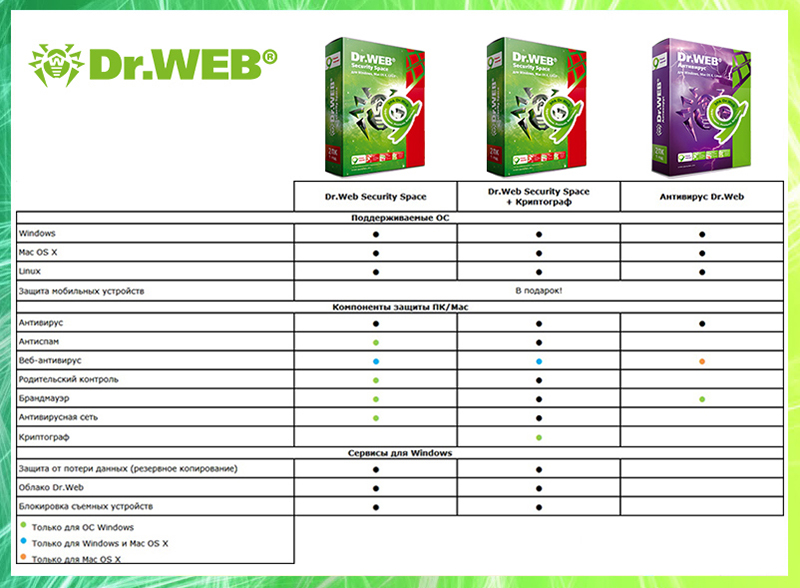 Dr.Web Security Space – комплексная защита от всех видов интернет-угроз для Windows, антивирус для Mac OS X и Linux: файловый и почтовый антивирус, SpIDer Guard и SpIDer Gate, родительский контроль, брандмауэр.